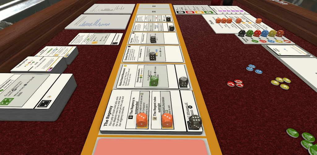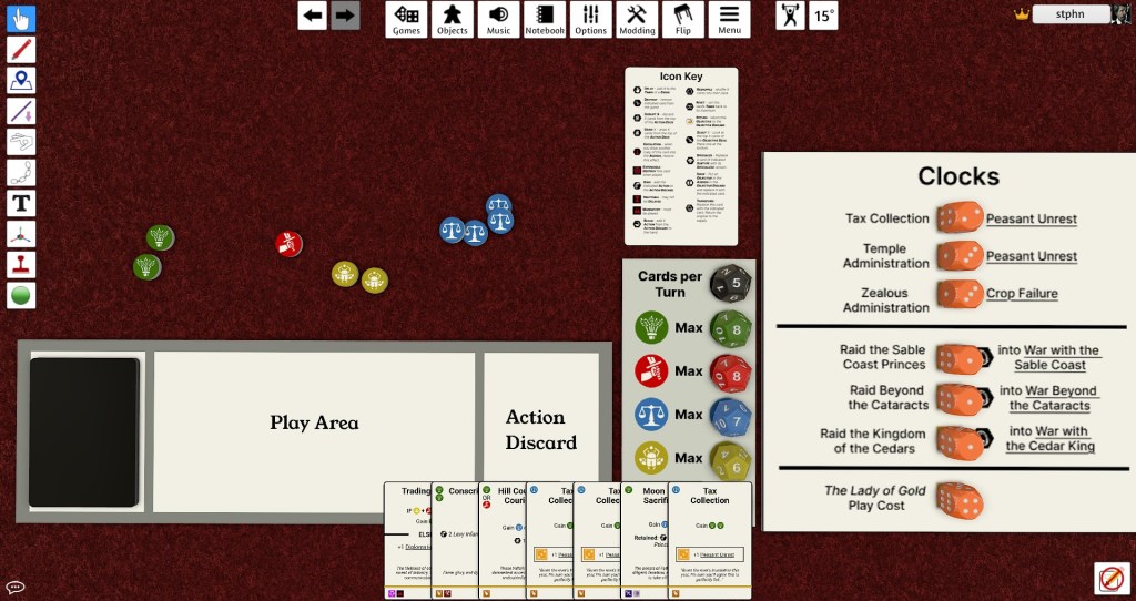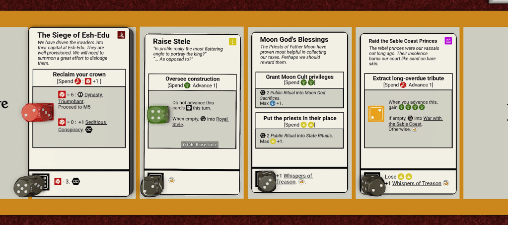 Mechanically, this game is a deckbuilder – you accumulate a set of social institutions which you can play in order to gather the resources necessary to deal with an escalating number of internal and external crises. My guiding principle in designing the game is that every turn should present a puzzle, which it is up to the player to figure out how to solve with the limited resources at their disposal. By design, this usually means making compromises or accepting long-term harms for short-term benefits. The traditions of dead turns weigh like a nightmare on the minds of the player, as it were.