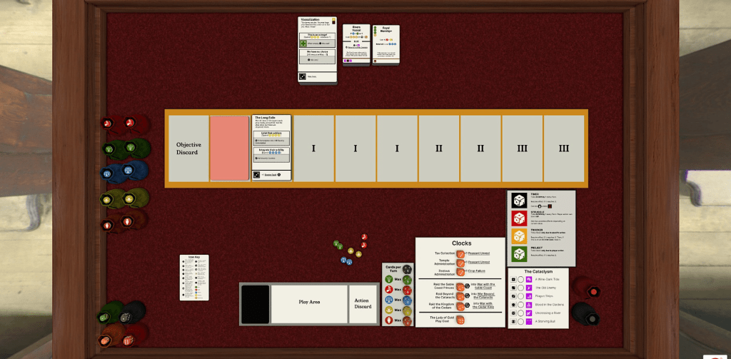 My goals in designing this game were threefold: first, to explore the historical strategy genre which is dominated by 4X titles like Sid Meier’s Civilization in a novel mechanical context; second, to make a game advancing a specific historical argument (see: “What I did,” below); and third, to make a game that tried to explore reactive, compromise and collapsed-focused gameplay rather than conventional narratives of infinite growth and player empowerment.